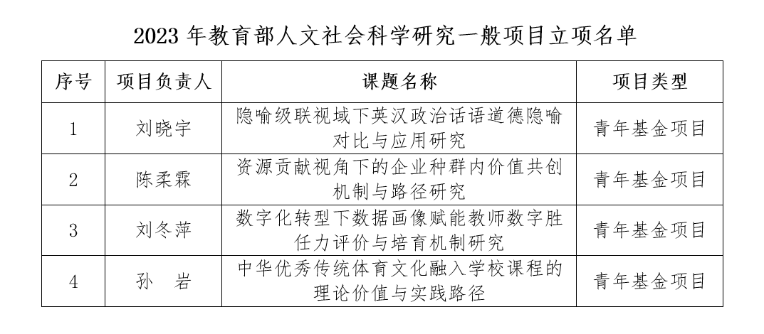 近日,教育部社科司对2023年度教育部人文社会科学研究一般项目评审结果进行公示,永利官网成功获批4项青年基金项目,立项数居省属高校并列首位,取得历史性新突破。